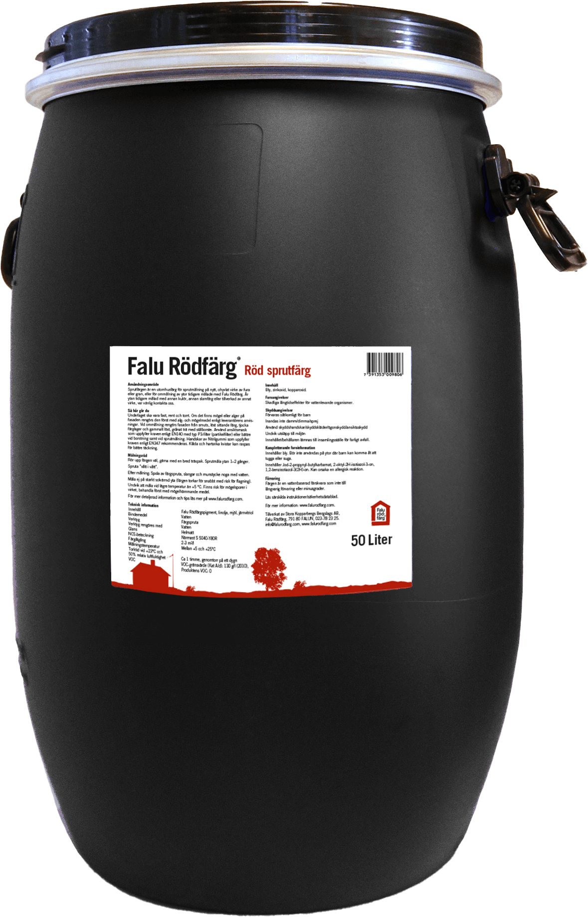 Falu Rödfärg sprutfärg finns i kulörerna Röd, Ljusröd samt Svart i 100 liters fat samt i Röd på 50 liters fat.